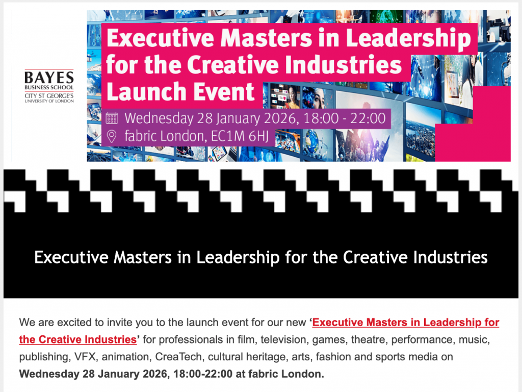 We are excited to invite you to the launch event for our new ‘Executive Masters in Leadership for the Creative Industries’ for professionals in film, television, games, theatre, performance, music, publishing, VFX, animation, CreaTech, cultural heritage, arts, fashion and sports media on Wednesday 28 January 2026, 18:00-22:00 at fabric London. |